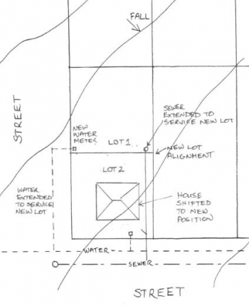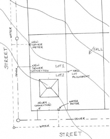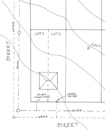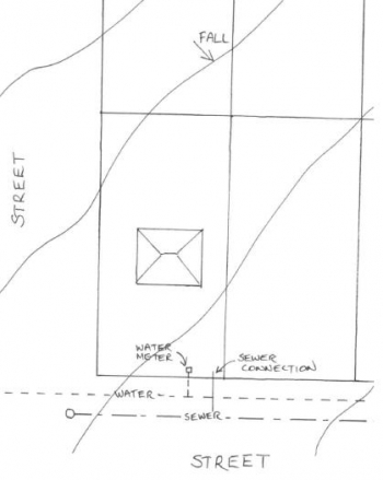 The second site starts out very similar, but it has a few differences. It has an existing house located in the middle of the property. It slopes away from the side street and towards the front street (see plan below). There is a sewer line located in the front street, as well as a water supply line, but there is no sewer or water supply line located in the side street. This site also consists of only one lot, though it is still the same size as the block in the first example.