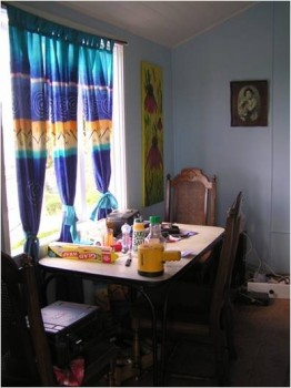 Before - Bulky furniture, dark walls and large (and ugly) curtains makes the room small.
